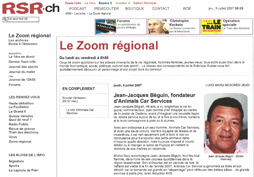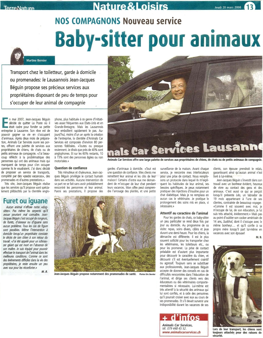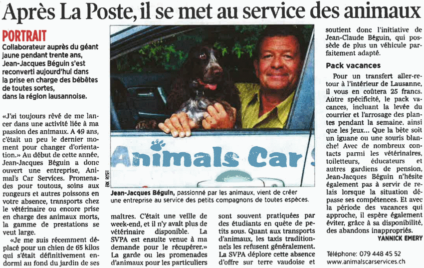 Animals Car Services by the local press The following items have been made by the local press and show the way "Animals Car Services" can help you. 24 Heures Newspaper Radio Station "Les rendez-vous de l'info". RSR.CH Nature & Loisirs Newspaper